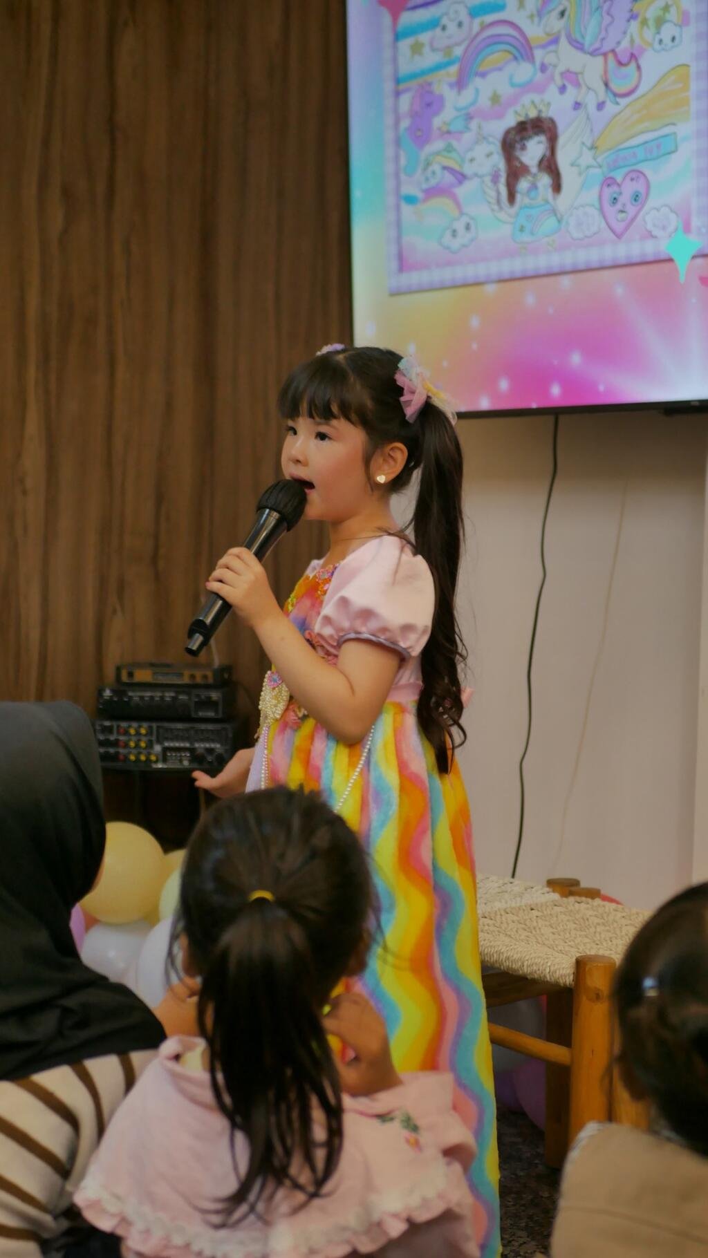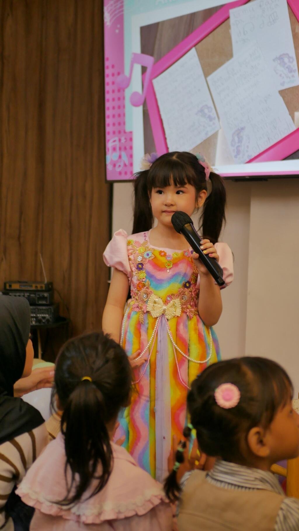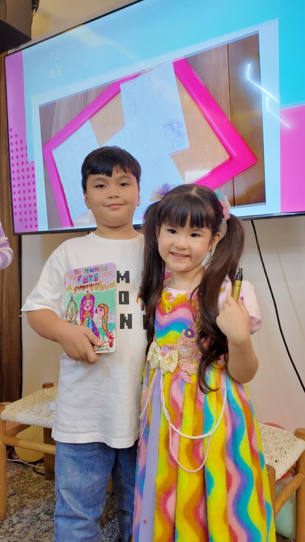 “Nah buku ini bercerita tentang kejujuran dan persahabatan di antara 4 princesses. Untuk percaya diri pada diri sendiri. Believe in yourself. Aku bayanginnya ada galaxy warna-warni pastel, banyak awan dan bintang. Ada kuda ajaib dengan tanduk emas dan aku punya sayap emas. Semua itu menggambarkan bahwa setiap anak bisa berkarya dengan imajinasinya sendiri,” tambah Ariana.